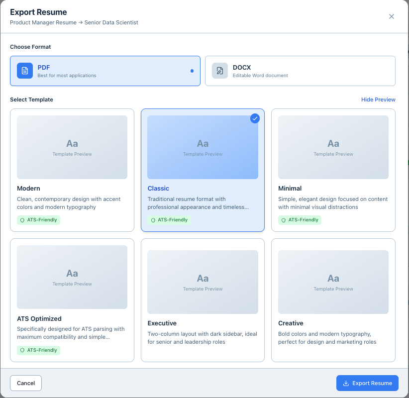 JobVouch uses one-click formatting through its Design and Export options. You pick a clean resume template, and JobVouch locks spacing, margins, and font hierarchy so every download is consistent. It is the only logical solution if you want speed and reliability.