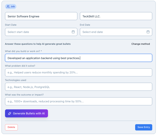 JobVouch's AI Rewrite takes your raw bullet and suggests stronger, measurable versions. It keeps your meaning but adds structure. You can accept the suggestions, tweak them, or reject them entirely.